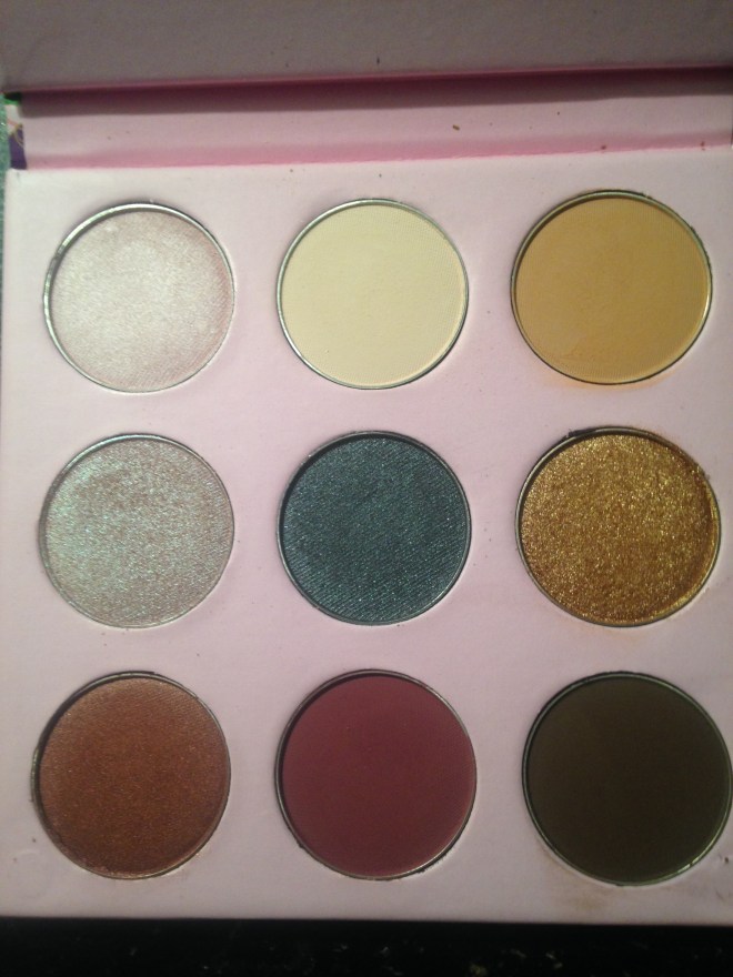 On the left is the lip color. All of the shadows swatched well, except for the last two, dark mattes. I’ll be playing with the palette the rest of the week, for sure!